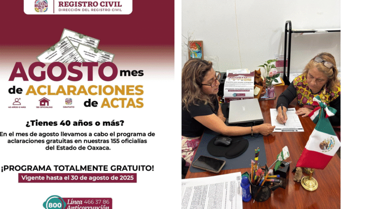 Oaxaca de Juárez, Oax. 8 de agosto de 2025.- El Gobierno del Estado, a través de la Dirección General del Registro Civil, lleva a cabo el programa Agosto, mes de Aclaraciones de Actas, con el fin de garantizar el derecho a la identidad de las y los oaxaqueños mayores de 40 años.