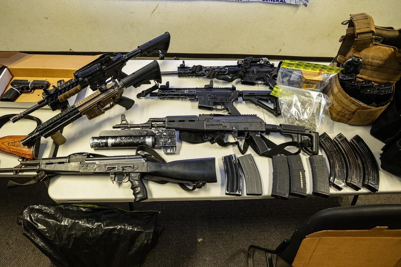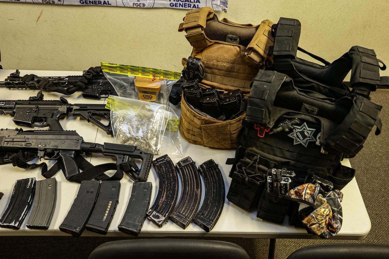 Asimismo, se incautó equipo táctico consistente en kits de chalecos balísticos, fornituras, cargadores abastecidos y un par de esposas.