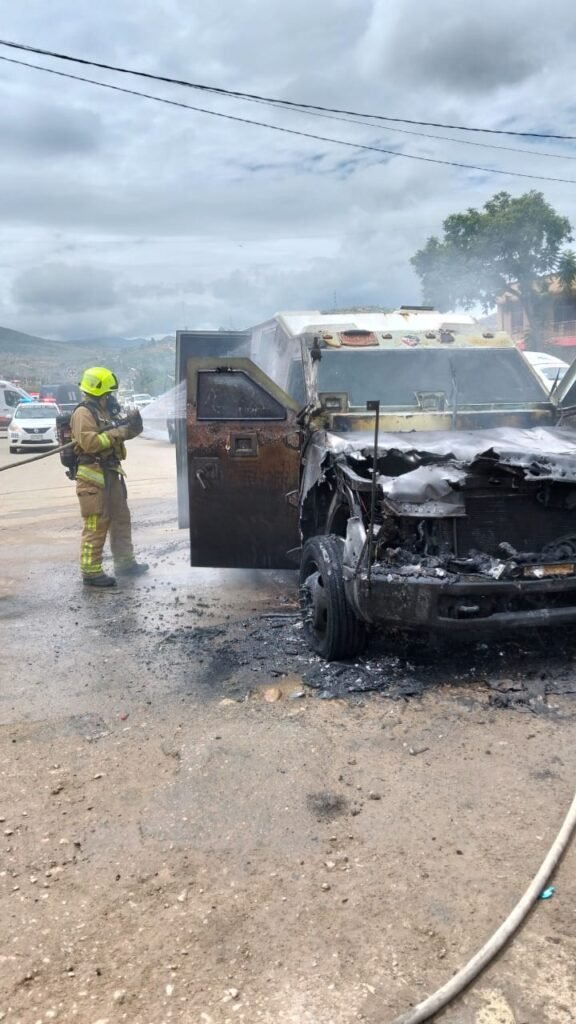Oaxaca de Juárez, Oax., 13 de junio de 2025.- Elementos del Heroico Cuerpo de Bomberos de Oaxaca (HCBO) atendieron el incendio de una unidad de transporte de valores sobre la carretera federal 175 Oaxaca – Puerto Ángel, en inmediaciones de la colonia Olimpo, perteneciente al municipio de la Villa de Zaachila.