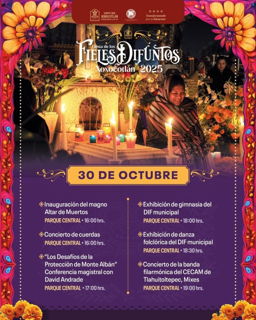 Como parte de las Fiestas de los Fieles Difuntos 2025, el Ayuntamiento de Santa Cruz Xoxocotlán, encabezado por la edil Nancy Benítez Zárate, contará con la presentación de la Banda Filarmónica del Centro de Capacitación Musical y Desarrollo de la Cultura Mixe (CECAM), una de las agrupaciones más emblemáticas de Oaxaca y de México.