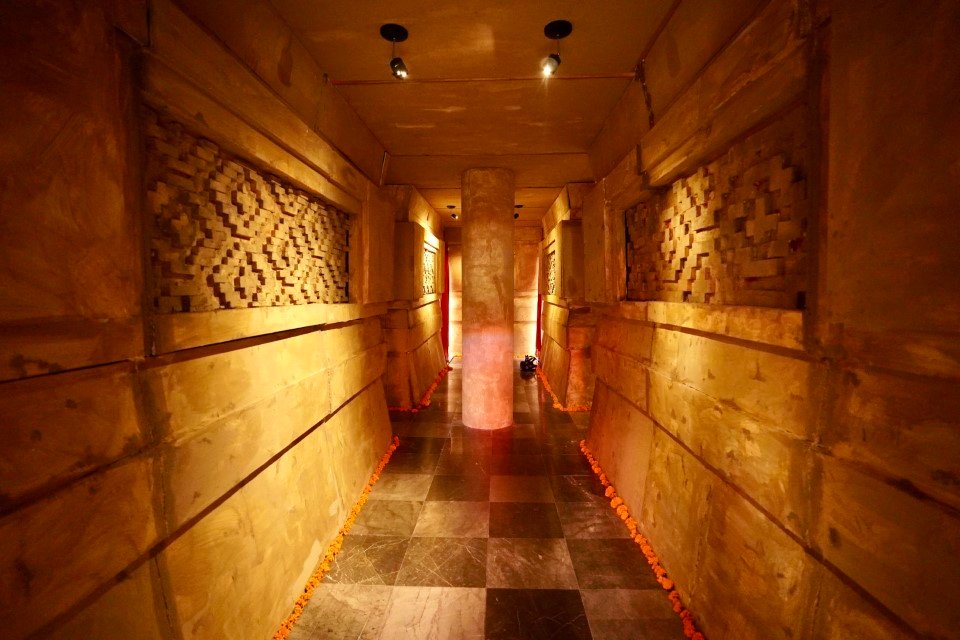 Junto a esta muestra, se instaló una recreación de la Tumba Fría o Tumba 1 de San Pablo Villa de Mitla, para que la población y visitantes pudieran apreciarla.