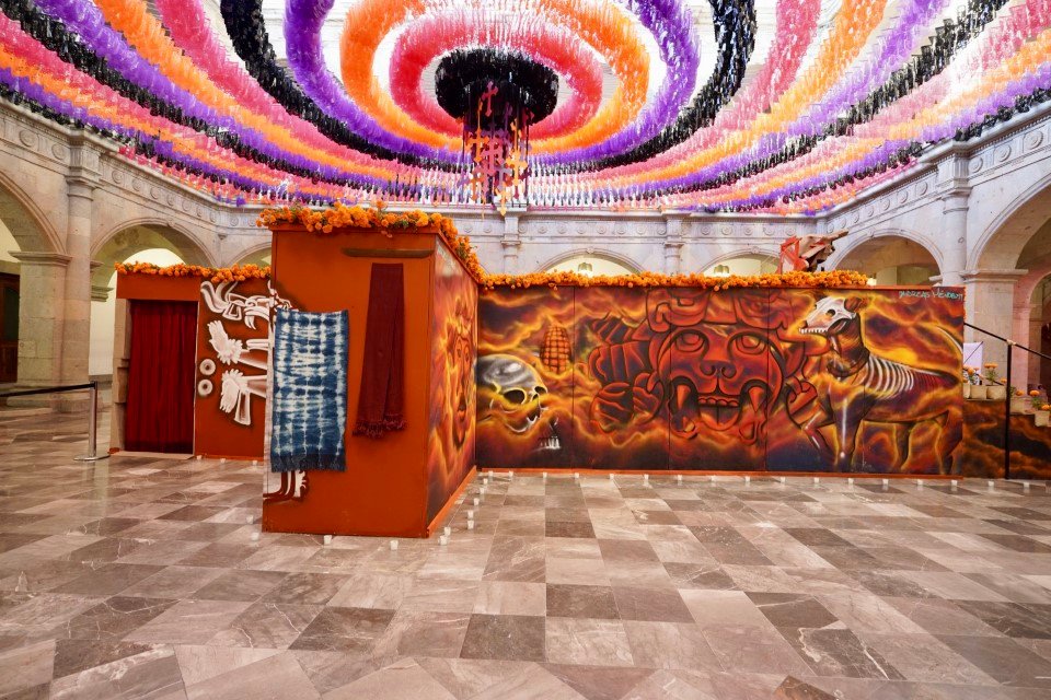 Oaxaca de Juárez, Oax. 6 de noviembre de 2025.- El Palacio de Gobierno fue el escenario en el cual las flores de cempasúchil, calaveras, velas, papel picado, fruta de temporada e imágenes religiosas; enmarcaron el Altar Monumental, apreciado por cerca de 15 mil oaxaqueñas y oaxaqueños, así como turistas nacionales e internacionales.