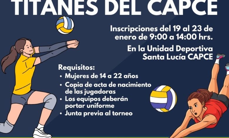 El 24 de enero, de 8:00 a 13:00 horas, en la Unidad Deportiva Santa Lucía CAPCE, se llevará a cabo el gran torneo relámpago de voleibol femenil “Titanes del CAPCE”; dirigido a mujeres de 14 a 22 años. Las inscripciones están abiertas desde el lunes 19 al viernes 23 de enero, en las oficinas del este espacio, en un horario de 9:00 a 14:00 horas.