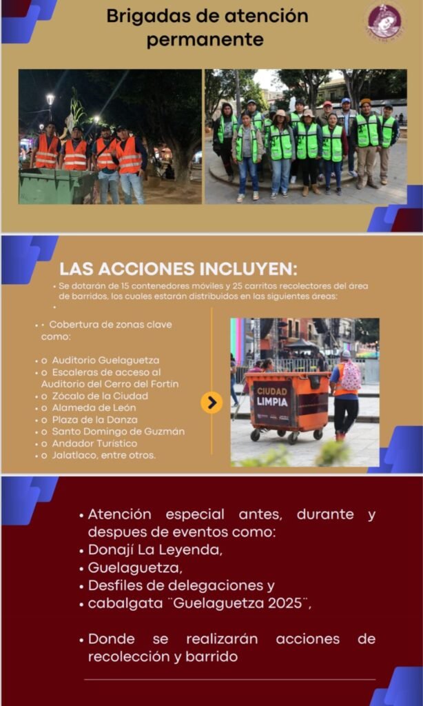 La frecuencia de recolección se ha incrementado, con turnos matutinos, vespertinos y nocturnos, y rutas diferenciadas para residuos reciclables y orgánicos. Las labores de barrido y recolección acompañan eventos clave como Donají La Leyenda, los desfiles de delegaciones y los Lunes del Cerro.