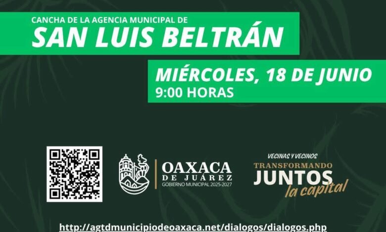 Oaxaca de Juárez, Oax., 17 de junio de 2025.– El Gobierno Municipal de Oaxaca de Juárez invita a la ciudadanía a participar en una nueva edición de los Diálogos Vecinales, que en esta ocasión se llevará a cabo en la cancha de la agencia municipal de San Luis Beltrán, este miércoles 18 de junio a partir de las 9:00 horas.