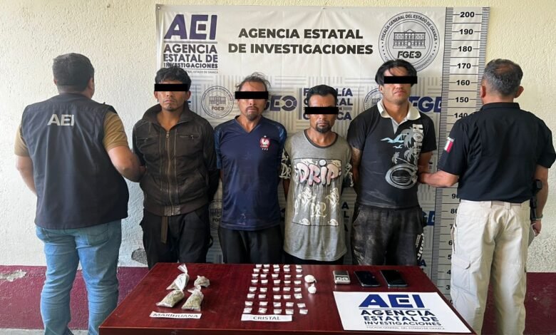 Oaxaca de Juárez, Oax. 14 de julio de 2025.- Derivado de un trabajo de inteligencia, la Fiscalía General del Estado de Oaxaca (FGEO) detuvo a cuatro personas del sexo masculino por el delito contra la salud en su modalidad de narcomenudeo, en hechos cometidos en la región de los Valles Centrales.