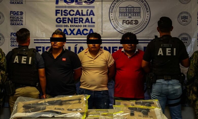 Oaxaca de Juárez, Oax., a 08 de abril de 2026.- Resultado de trabajos de inteligencia criminal, la Fiscalía General del Estado de Oaxaca (FGEO), en coordinación con el Gabinete de Seguridad, logró la detención de tres hombres identificados como J.S.O., A.E.T. y B.O.M., por un multihomicidio registrado en el Istmo de Tehuantepec, además que las investigaciones establecieron que los imputados estarían relacionados con una red de extorsión vinculada a delitos como homicidio, extorsión, robo, entre otros.