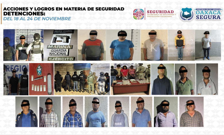 Oaxaca de Juárez, Oax., 26 de noviembre de 2025.- La Secretaría de Seguridad y Protección Ciudadana (SSPC) informó que, del 18 al 24 de noviembre, llevó a cabo 477 acciones estratégicas orientadas a fortalecer la paz y tranquilidad de las familias oaxaqueñas.