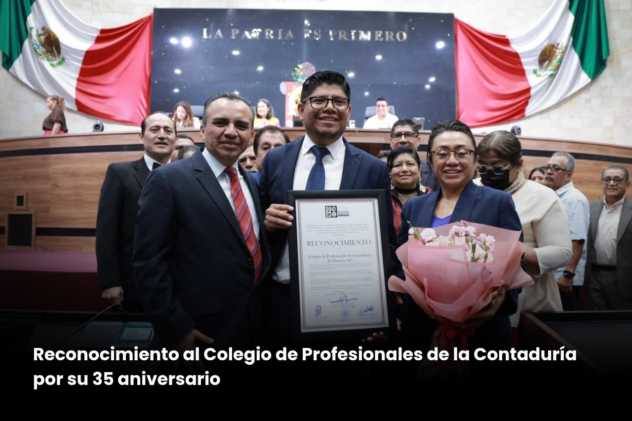 San Raymundo Jalpan, Oax., a 12 de marzo de 2026.- Con la finalidad de honrar la trayectoria de los organismos de la sociedad civil que abonan en la consolidación del sector económico de la entidad, el Congreso del Estado otorgó un reconocimiento al Colegio de Profesionales de la Contaduría de Oaxaca, A.C., con motivo de su 35 aniversario, en relación a su invaluable aportación dentro de la contaduría pública.
