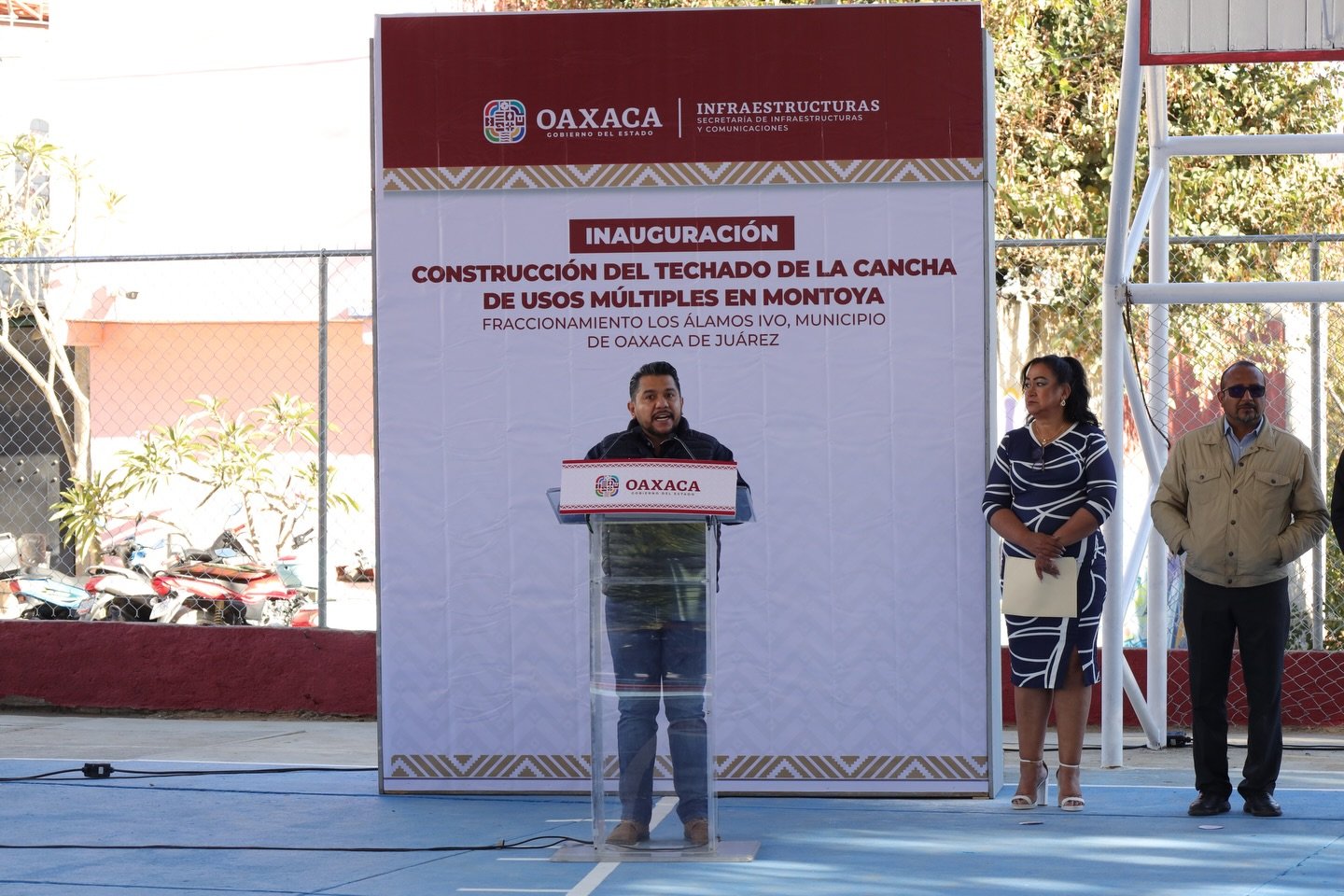 Oaxaca de Juárez, Oax. 8 de febrero de 2026. El Gobernador Salomón Jara Cruz inauguró la construcción del techado de la cancha de usos múltiples del fraccionamiento Álamos IVO en la agencia Montoya del municipio capitalino, que permitirá a las familias contar con un espacio de sana convivencia, fomento al deporte y la prevención de conductas de riesgo, especialmente entre la niñez y las juventudes.