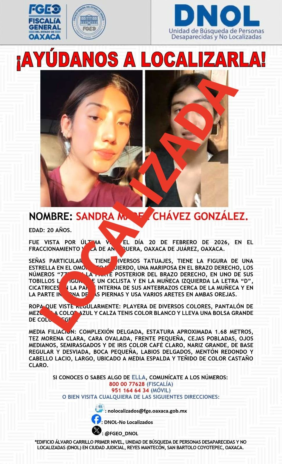 Tras recibir la denuncia por parte de sus familiares, la FGEO, a través de la Unidad de Búsqueda de Personas Desaparecidas y No Localizadas (DNOL), adscrita a la Vicefiscalía General de Atención a Víctimas y Derechos Humanos, activó de inmediato los protocolos correspondientes para realizar las labores especializadas de búsqueda. Como resultado de estos trabajos, S.M.C.G., fue localizada el 11 de marzo de 2026.