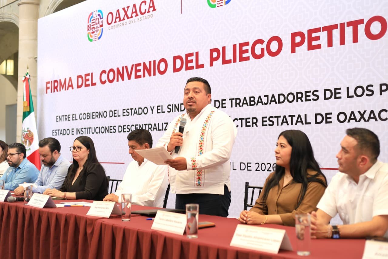 Oaxaca de Juárez, Oax. 27 de abril de 2026.- El Gobierno del Estado y el Sindicato de Trabajadores de los Poderes del Estado e Instituciones Descentralizadas de Carácter Estatal de Oaxaca (STPEIDCEO) firmaron este 27 de abril el Convenio del Pliego Petitorio 2026.