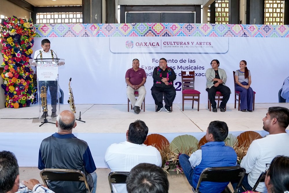 “La música es el corazón de un pueblo, de una comunidad y tenemos que seguir promoviéndola”, expresó en este evento, en el que de manera simbólica entregó instrumentos a las autoridades municipales de San Pedro Cajonos, San Juan Cotzocón y Santa María Yucuhiti.