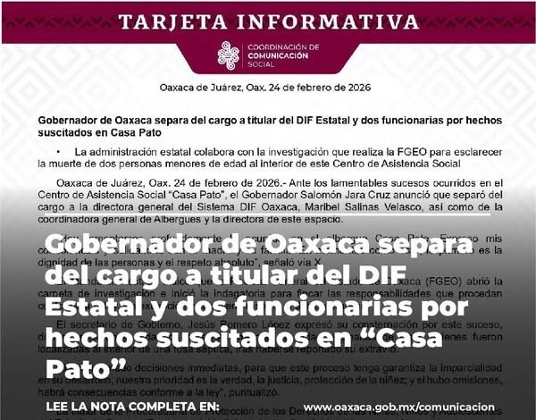 Oaxaca de Juárez, Oax. 24 de febrero de 2026.- Ante los lamentables sucesos ocurridos en el Centro de Asistencia Social “Casa Pato”, el Gobernador Salomón Jara Cruz anunció que separó del cargo a la directora general del Sistema DIF Oaxaca, Maribel Salinas Velasco, así como de la coordinadora general de Albergues y la directora de este espacio.