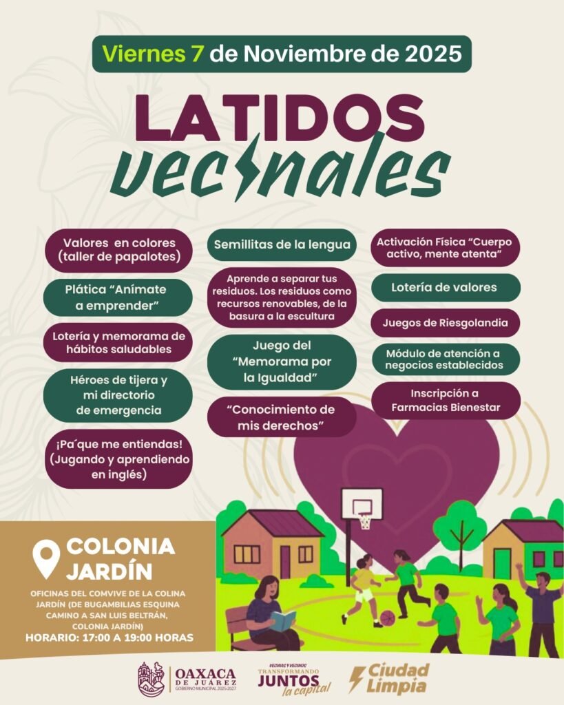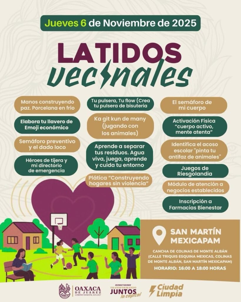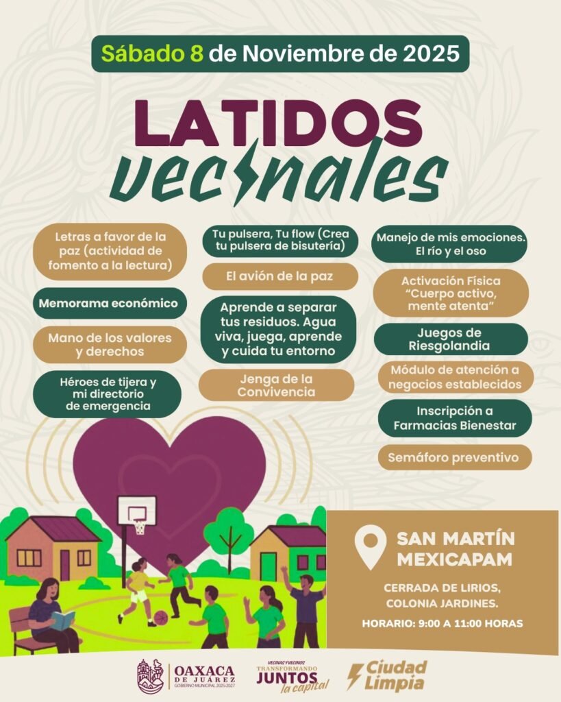 Oaxaca de Juárez, Oax., 6 de noviembre de 2025.- El Gobierno Municipal de Oaxaca de Juárez invita a las y los habitantes de la capital a participar en una nueva edición del programa Latidos Vecinales, una iniciativa que promueve la paz, la salud, la educación y el cuidado del entorno mediante actividades recreativas, talleres formativos y acciones de proximidad ciudadana.