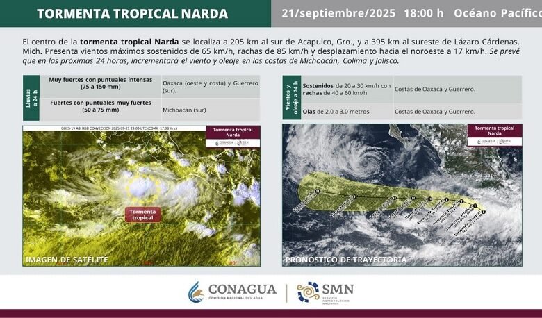 Oaxaca de Juárez, Oax. 21 de septiembre de 2025. La Coordinación Estatal de Protección Civil y Gestión de Riesgos (CEPCyGR) informa sobre la formación de la tormenta tropical Narda, que se desplaza en paralelo a la costa grande de Guerrero, sin que hasta el momento represente peligro directo para el territorio oaxaqueño.