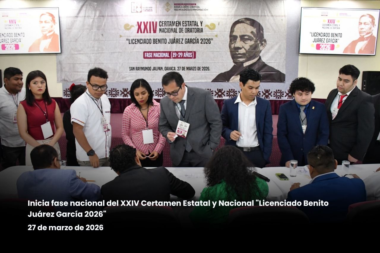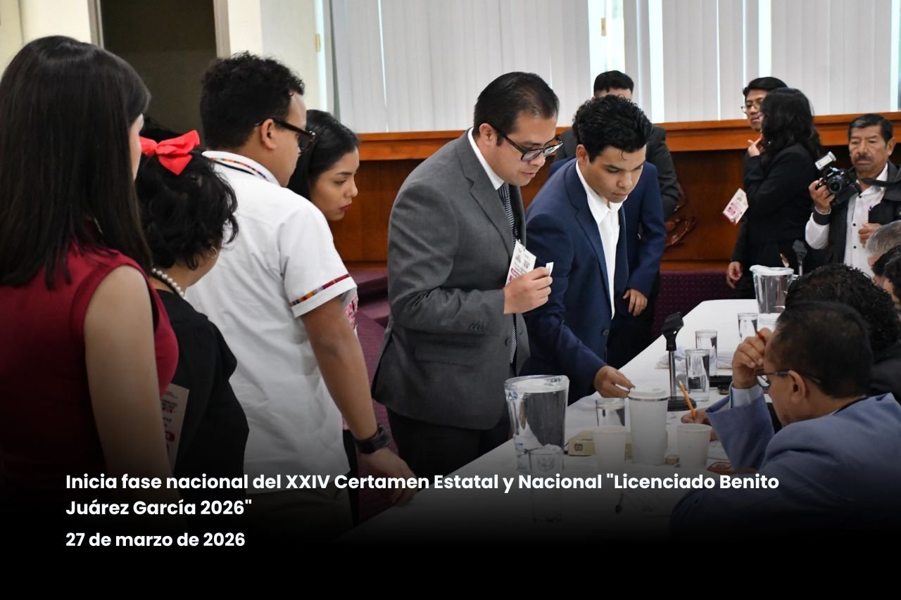 San Raymundo Jalpan, Oax., a 27 de marzo de 2026.- En el Congreso del Estado dio inicio la fase nacional de la edición XXIV del Certamen Estatal y Nacional de Oratoria “Licenciado Benito Juárez García 2026”, con el objetivo de fomentar la libre expresión, el pensamiento crítico y la participación de las juventudes en los asuntos públicos a través del arte de la palabra.