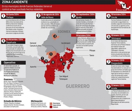 Arcelia, en Guerrero, y Tlatlaya, en el Estado de México, están unidos por un camino vecinal y la región está afectada por la presencia de células de ese grupo del crimen organizado, vinculado al tráfico de drogas, la extorsión, el cobro de derecho de piso, los secuestros y homicidios.