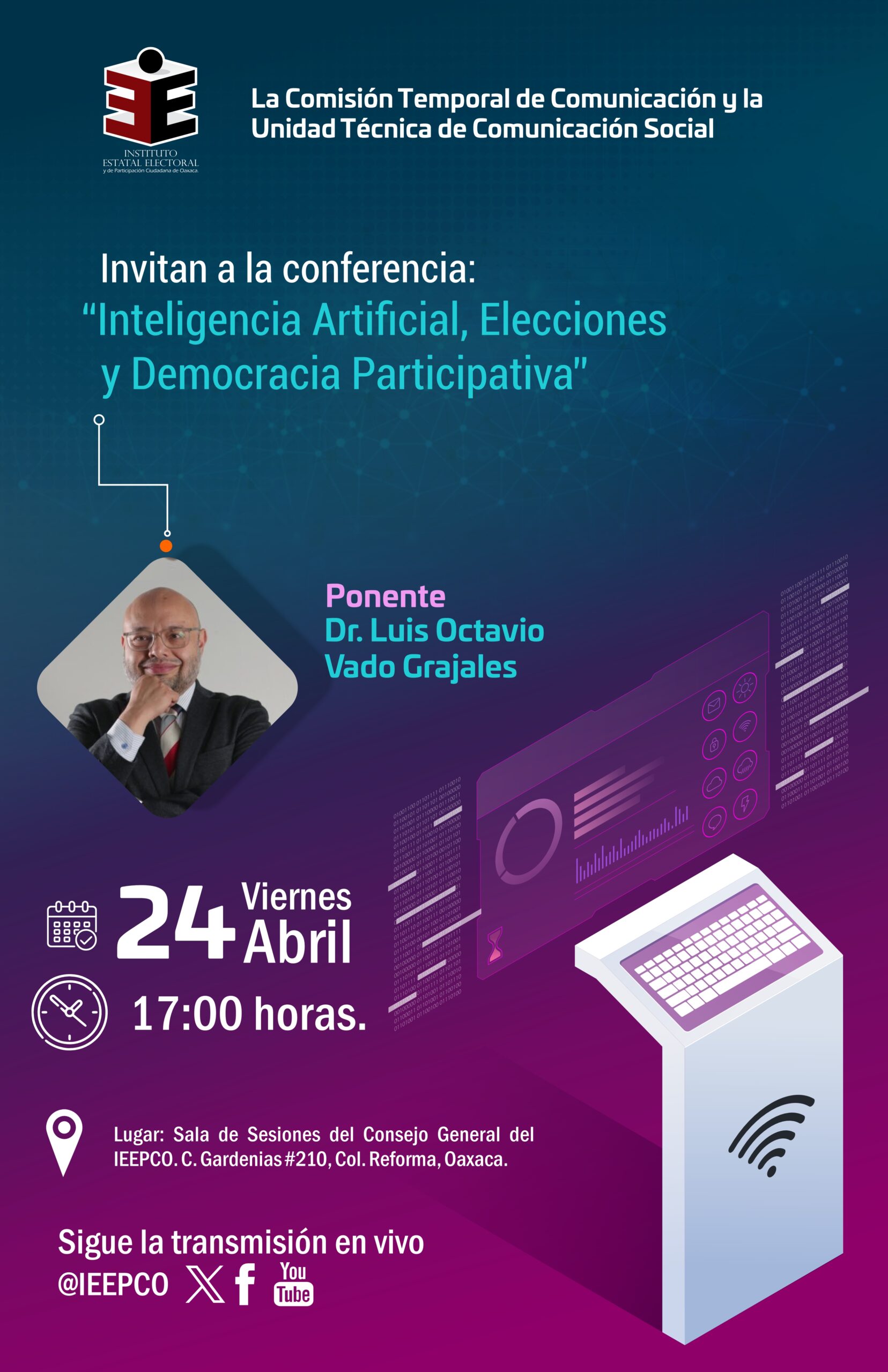 Asimismo, en el contexto de la línea de acción “Capacitación al personal del IEEPCO para fortalecer sus habilidades y competencias en materia de comunicación institucional”, establecida en el Plan Anual de Trabajo 2025-2026 de la CTC, el mismo día se impartirá la conferencia “Inteligencia Artificial, Elecciones y Democracia Participativa”, a cargo del Dr. Luis Octavio Vado Grajales.
