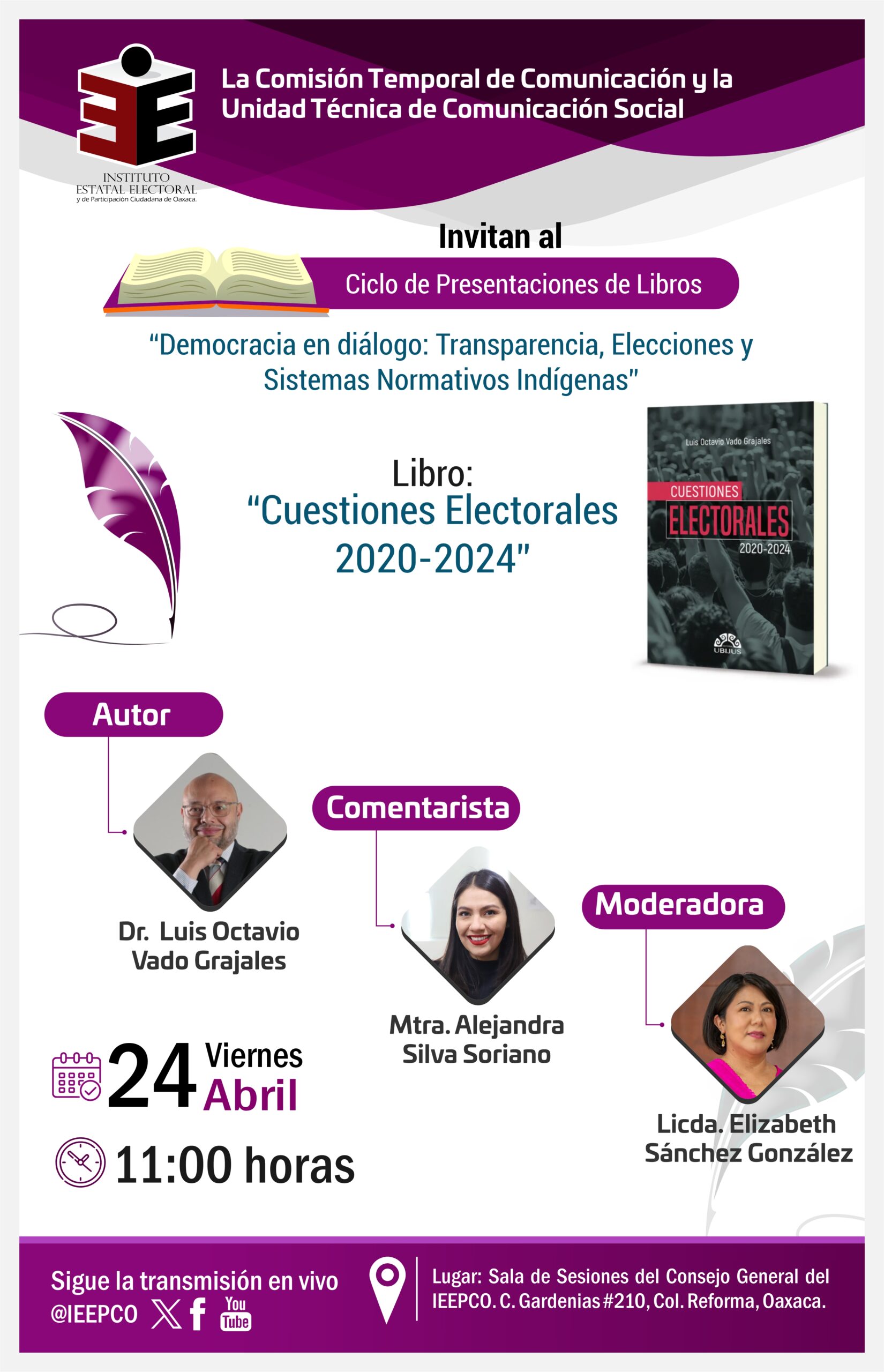En el marco del Ciclo de Presentaciones de Libros “Democracia en diálogo: Transparencia, Elecciones y Sistemas Normativos Indígenas”, impulsado por la Comisión Temporal de Comunicación (CTC) y la Unidad Técnica de Comunicación Social (UTCS) del Instituto Estatal Electoral y de Participación Ciudadana de Oaxaca (IEEPCO), se llevará a cabo la presentación del libro “Cuestiones Electorales 2020-2024”, de la editorial UBIJUS.