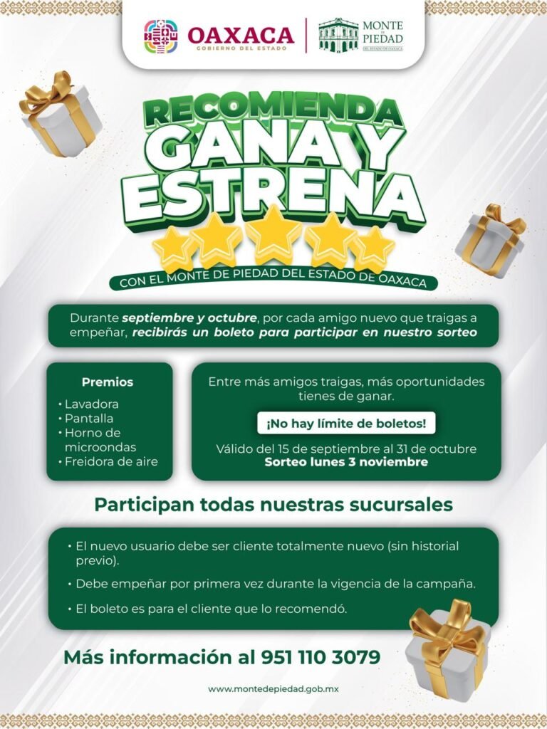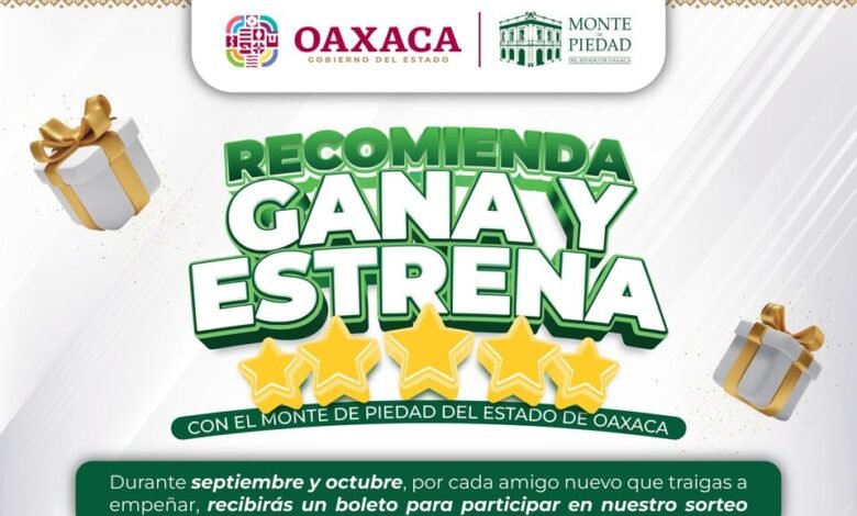Oaxaca de Juárez, Oax. 17 de septiembre de 2025.- El Monte de Piedad del Estado de Oaxaca invita a las y los oaxaqueños a participar en el sorteo “Recomienda, Gana y Estrena”, que se llevará a cabo el próximo 3 de noviembre, para premiar la confianza de sus pignorantes e incentivar la llegada de nuevas personas usuarias a las sucursales.