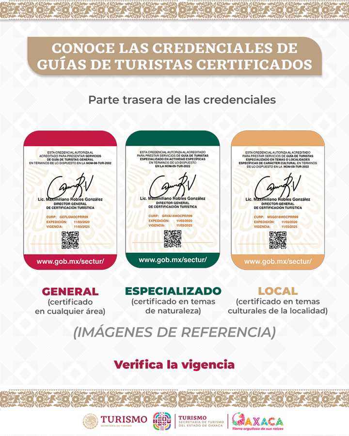 La dependencia informa que las y los guías de turistas certificados se identifican con una credencial emitida por la Sectur federal, clasificada en tres tipos: general, especializado y local; la cual incluye foto, nombre, especialización, idiomas, y al reverso, fecha de expedición, vigencia y código QR para verificar su autenticidad.