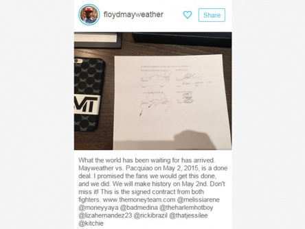 Lo que el mundo ha estado esperando llegó. Mayweather contra Pacquiao el 2 de mayo de 2015, es un hecho’, escribió Mayweather, quien con una fotografía mostró el contrato firmado para la deseada batalla, la cual se espera sea la más millonaria en la historia.