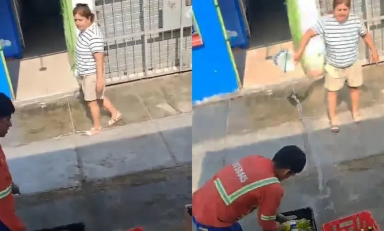 En Lima, Perú, un hecho registrado en video ha causado gran controversia en redes sociales. Una mujer fue captada arrojando agua a un joven repartidor de refrescos que descargaba productos frente a su casa-negocio, presuntamente identificado como la “Lavandería Free Matic” en el distrito de Los Olivos.