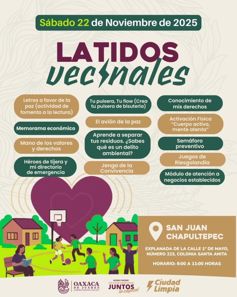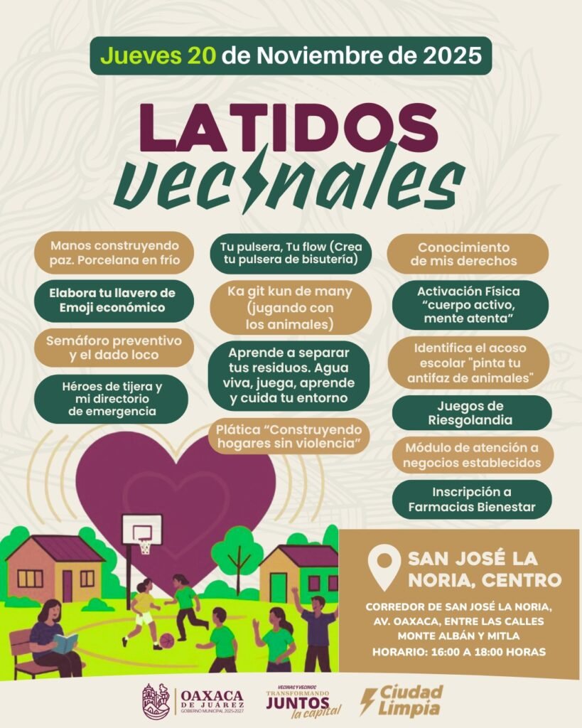 Oaxaca de Juárez, Oax., 20 de noviembre de 2025.— El Municipio de Oaxaca de Juárez continuará esta semana con nuevas jornadas de Latidos Vecinales, una estrategia impulsada por el presidente municipal Ray Chagoya para acercar actividades formativas, recreativas y de convivencia a niñas, niños, jóvenes y familias de diferentes colonias de la capital. Esta acción forma parte del compromiso municipal por consolidar una ciudad limpia, segura y cercana a sus habitantes.