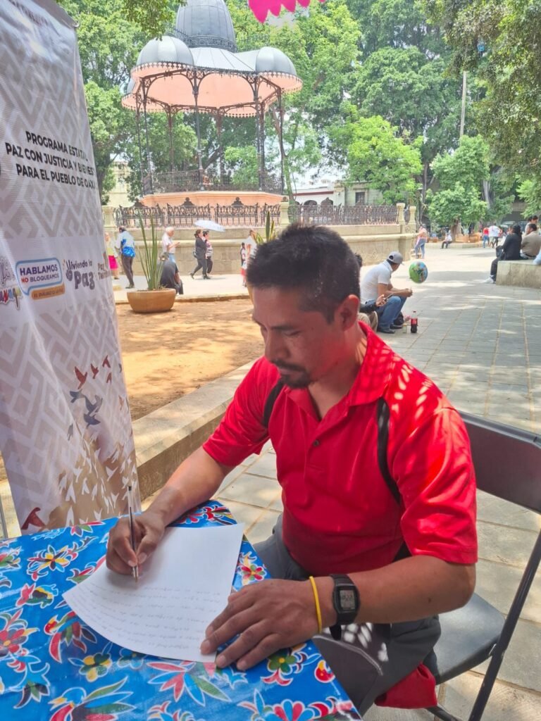 A través de un espacio ubicado en el zócalo de la capital oaxaqueña, habitantes locales escriben cartas dirigidas a visitantes de diversos estados de la República Mexicana y de otros países; a fin de establecer un puente para el diálogo y el entendimiento.
