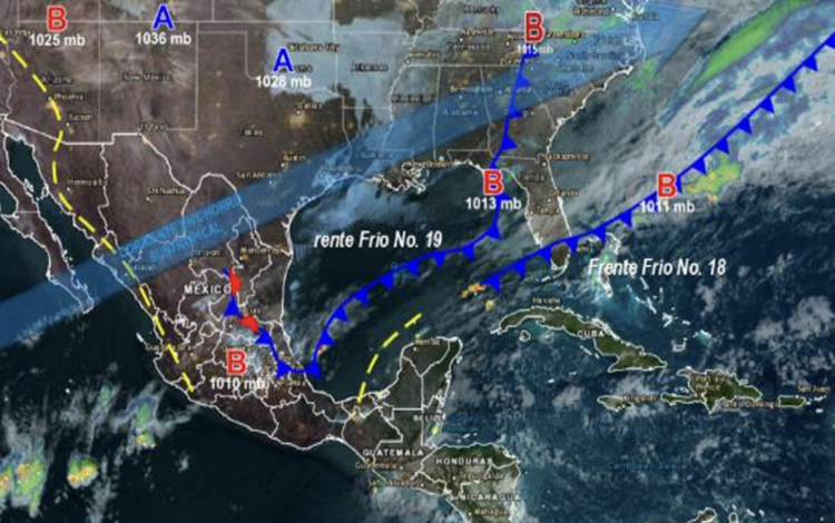 El frente frío número 19 que se extiende desde Estados Unidos hasta el centro-sur de Veracruz, impulsado por una masa de aire frío, generará en su avance hacia el sureste, incremento de nubosidad y lluvias en la mitad norte del estado, con mayor intensidad en la Cuenca del Papaloapan, Sierra de Flores Magón y el norte del Istmo de Tehuantepec.