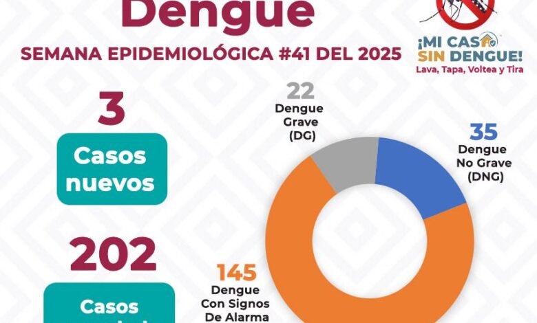 En total, se han registrado 202 casos positivos acumulados en Oaxaca, de los cuales 35 corresponden a Dengue No Grave (DNG), 145 a Dengue con Signos de Alarma (DCSA) y 22 como Dengue Grave (DG); además de tres defunciones.