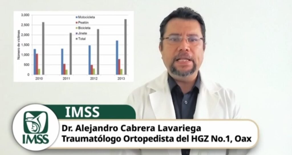 El médico traumatólogo ortopedista adscrito al Hospital General de Zona (HGZ) No. 1, doctor Alejandro Cabrera Lavariega, explicó que, ante el incremento significativo de accidentes en motocicleta registrados en el área de Urgencias, es urgente fortalecer las acciones preventivas para reducir el riesgo de lesiones graves, discapacidades permanentes e incluso la pérdida de vidas.