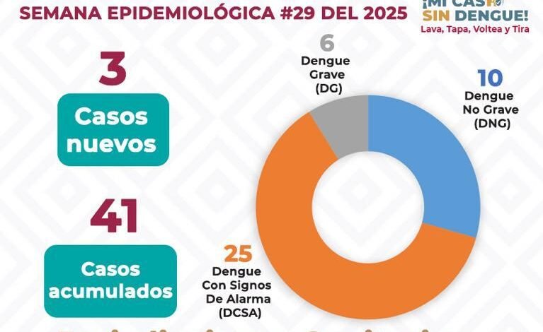 Durante la semana epidemiológica número 29, se confirmaron tres nuevos casos de dengue en los municipios de Matías Romero Avendaño, San Juan Bautista Tuxtepec y San Lucas Ojitlán, lo que suma un total de 41 casos acumulados en la entidad. De estos, 25 corresponden a hombres y 16 a mujeres.