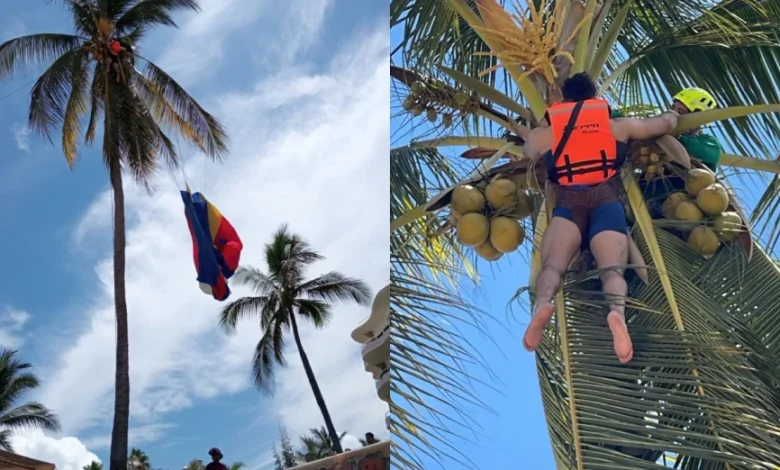 Regio se atora en palmera cuando se paseaba en paracaídas en playa en Nayarit