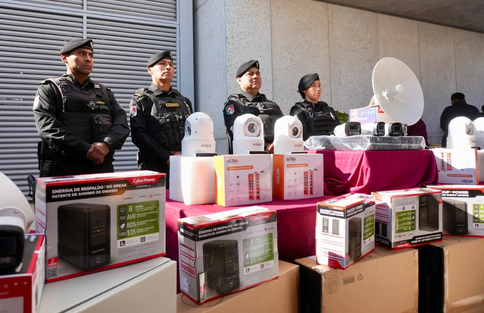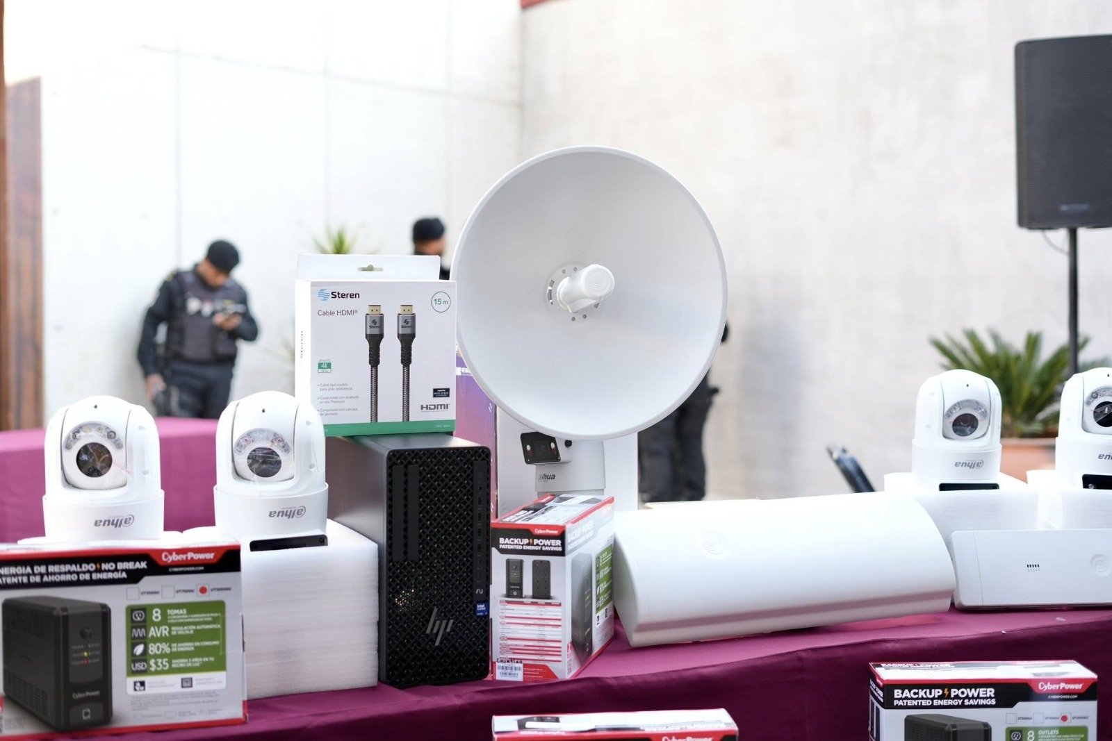 Esta entrega, que asegura y fortifica la coordinación entre municipios y estado, consistió en: 451 cámaras fijas, 133 tipo PTZ, unidades de respaldo de energía, enlaces de microondas, postes de videovigilancia, estaciones de trabajo, controladores, pantallas, grabadores, escritorios y sillas.