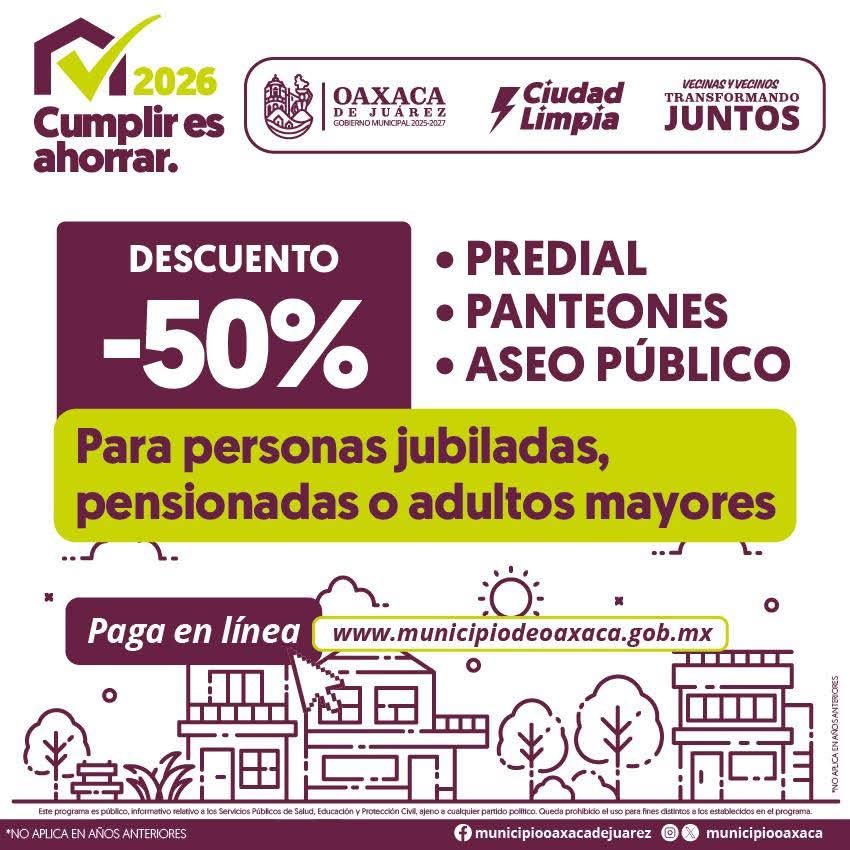 Oaxaca de Juárez, Oax. 20 de enero 2026.- En conferencia de prensa, el presidente municipal Ray Chagoya informó que continúa vigente el descuento del 50 por ciento en el pago del impuesto predial para personas adultas mayores.