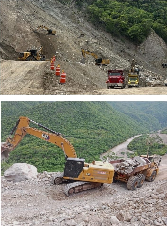 De esta manera, se implementa un solo turno en el que se emplean seis excavadoras, dos cargadores 966, dos camiones articulados, dos tractores, una motoconformadora y 16 volteos. Las piedras grandes están siendo movidas a través de camiones articulados.