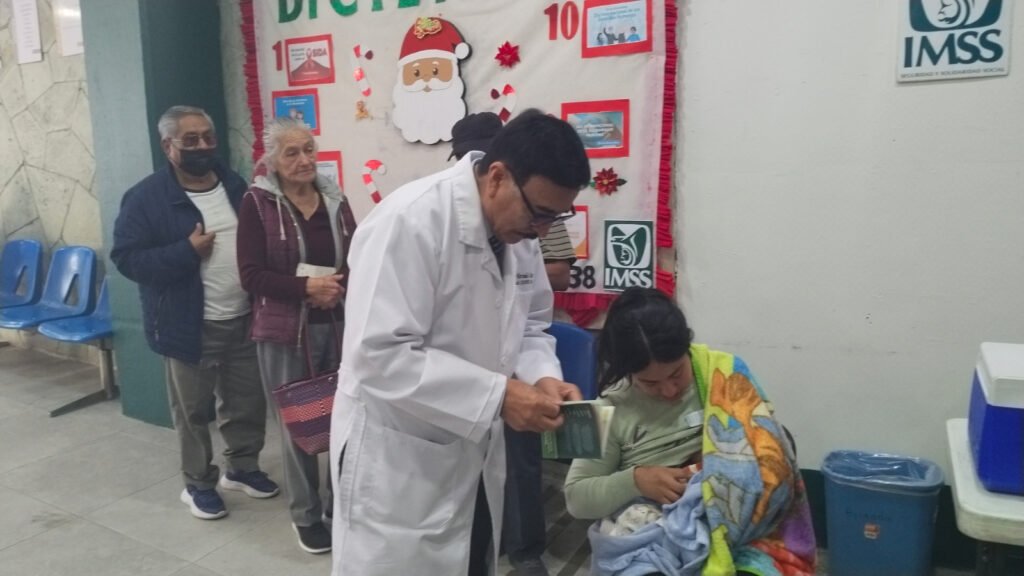 En las UMF No. 38 y 65, luego de constatar que se aplica el biológico contra la influenza, COVID-19 y Neomococo, a los adultos mayores y niños, también pudo observar que derechohabientes recibieron sus medicamentos completos en el área de Farmacia.