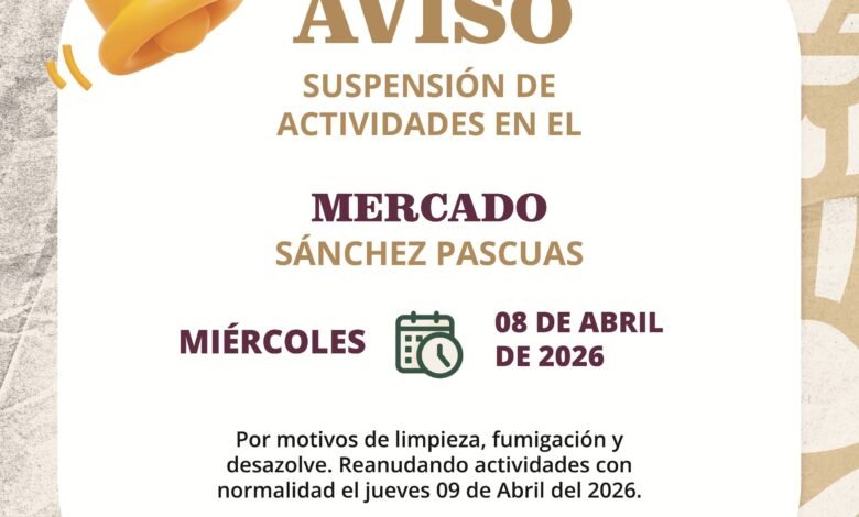 El Municipio de Oaxaca de Juárez informó que el próximo miércoles 08 de abril de 2026 se suspenderán temporalmente las actividades en el Mercado Sánchez Pascuas, como parte de una jornada integral de limpieza y mantenimiento.